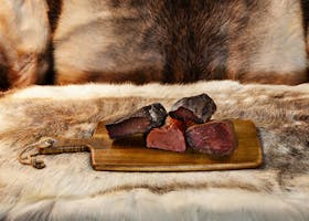 1 st Torkat älgkött ca 150g, 1 st Gravad älgstek ca 250g, 1 st Kallrökt älgstek ca 250g och 1 st Delikatessrökt älgstek ca 250g.